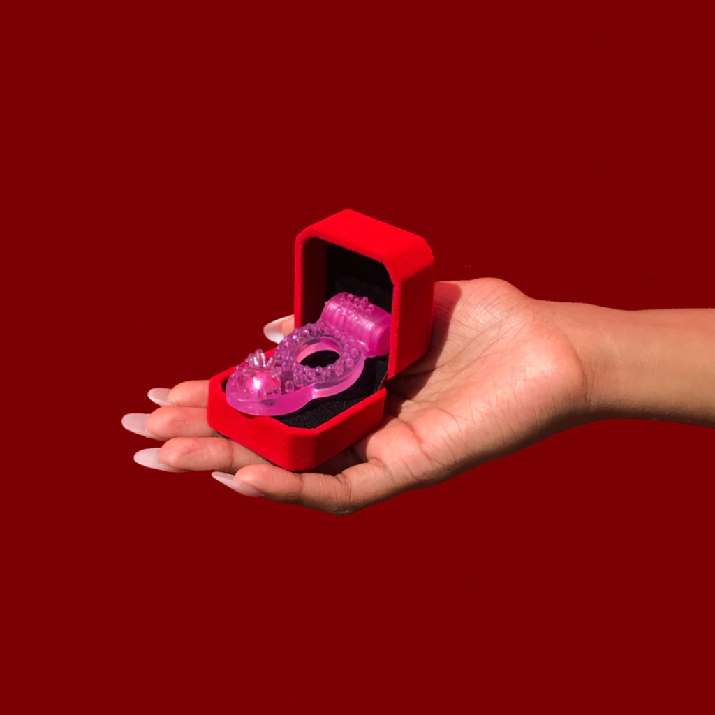 Anel Peniano com vibro e texturas que estimulam o clítoris da mulher e o escroto do parceiro (saco) durante a relação sexual.